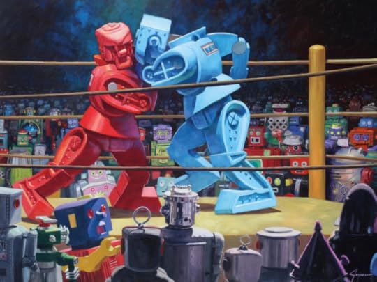 I don't think all the paintings are perfect, but Joyner has an eye for adventurous composition. Cupcakes are blown up to the sizeo f mountains in the distance, robots are posed in a bar fight, there are some good things in there!
