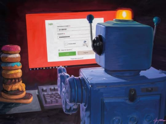 Robotic existentialism by Eric Joyner makes you think about what is missing in life. As a layman I cannot explain his painting techniques. His absurd surrealist simplicity has a certain kind of enigma that will question the foundation of existence.