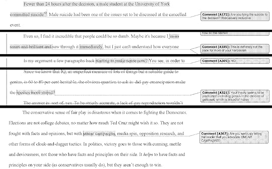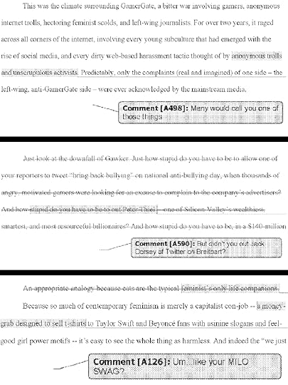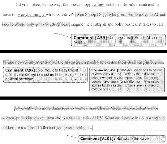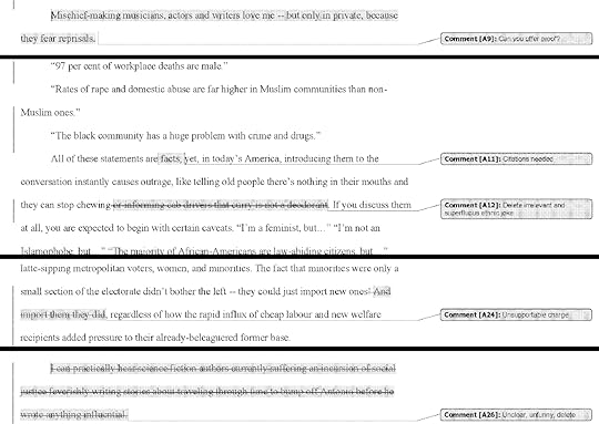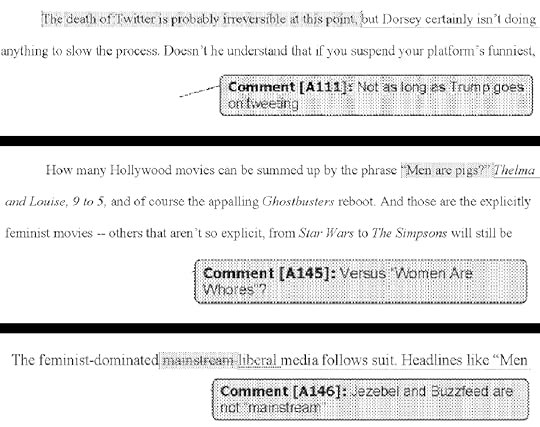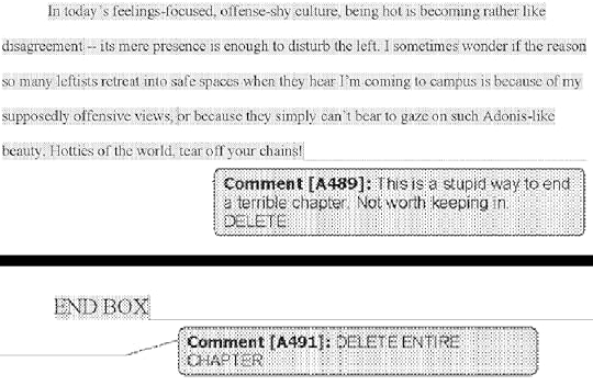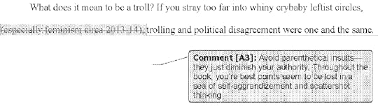 And by that, I of course mean M. Yiannopoulos' original Dangerous manuscript for Simon & Schuster, complete with Mitchell Ivers' editor notes. As you may know, the book deal has since been scrapped, but this gem still exists out there; and if I can read it, I can certainly share it.