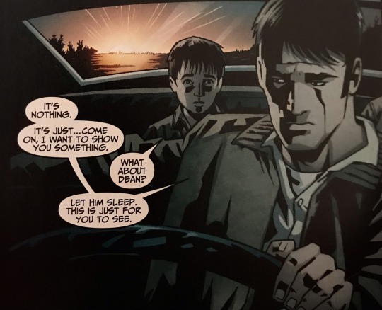 at one point Sam laments that they "haven't eaten in like two days," John showing up to his kids covered in blood, Dean as a twelve year old is assaulted via a harsh kiss by Mrs. Lyle (Lilith)--actually, the entire Mrs. Lyle arc is unsettling due to her position as Sam's teacher when he's nine now, and how she later tries to seduce him to sleep with her to make a deal in season four. The comic isn't afraid to rely on the metaphor of demons for sexual power dynamics and consent--demonic possession as a metaphor for rape is a theme in the show itself, but the metaphor expands out here to a non-consensual kiss to a 12-yr-old and lilith's general sexualization of Dean. There's more than this of course but this is the most obvious example. it's so well done and in pefect conjunction with sam's lack of autonomy in the comic.