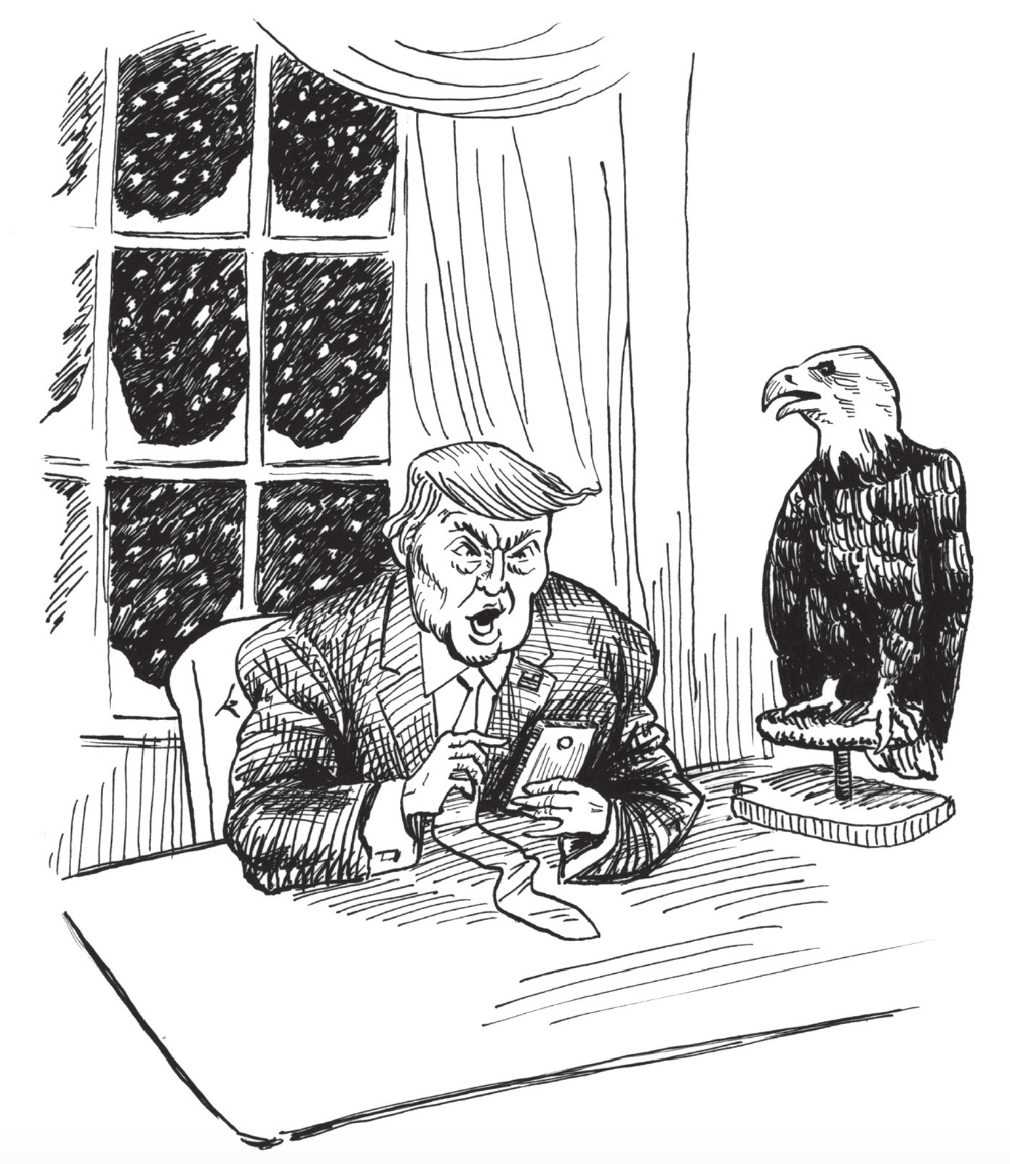 Bill Clinton is the jovial Ghost of Christmas Past and Barack Obama, the “big-eared” Ghost of Christmas Present. The Ghost of Christmas Yet to Come shows Ebenezer how the repeal of ObamaCare finishes off Tiny Tim and how his irresponsible tweeting has led to the USA becoming a nuclear waste land by 2025. The story opens with Ivanka inviting him to spend Christmas with her family. Trump’s response is I’ve told you a thousand times: Christmas sucks. We’re talking humbug, bigly.. And so the jokes at Trump’s expense go on.