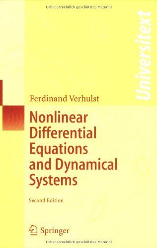 Therefore, we wish to propose Ferdinand Verhulst’s Nonlinear Differential Equations and Dynamical Systems (Springer-Verlag Universitext, second edition, 1996) as ideal for this purpose. This beginning graduate-level textbook is gently paced, not at all technically forbidding, furnished with good homework exercises and manageable in overall length. But beware: the blurb on the back cover claims, ‘Thus the reader can start to work on open research problems, after studying this book’ – which may well be overoptimistic, if we note that the level is just not high enough and many of the harder theorems are not proved, especially in the later chapters on bifurcation theory and Hamiltonian systems.