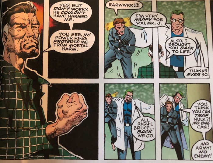 As an avid reader of the series growing up in the mid-1990s, I was often frustrated during the “savage Banner” phase of the Hulk’s life. It put a cap on his strength and forced him to hold back against foes he would normally be able to cut loose against. At the same time, one can appreciate what Peter David was trying to accomplish: as with the Mr. Fixit stories years before, he shook things up in an unexpected way by taking the dichotomy of Banner/Hulk and completely inverting it. The concept of a smart Hulk who has to hold his temper in check for fear of reverting to a raging human form in the midst of battle harkens back to the character’s early days, when stress would act as the cause of the man-to-monster transformation and vice versa (this would be before the calm/anger trigger would be established as the “norm” for the Hulk). This new wrinkle also serves a two-fold purpose: one, it effectively conveys the character’s feelings of loss and helplessness in a profound way. An increasing number of the stories David wrote during this period placed the Hulk in situations in which his key asset--limitless physical power—was useless, and his new incarnation, being helpless in both mind and body, is a reflection of that. Secondly, most significantly, it reins in the merged Hulk’s superiority complex by taking him down a few notches, forcing him to confront his own mortality. The savage Banner didn’t last very long, but it did endanger his life on a number of occasions and served as a catalyst for several upcoming storylines.