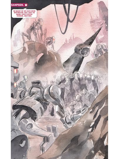I appreciate the ambition behind the dramatic double-foldout toward the end of the volume, but...none of the depicted worlds, all in the throes of a bloody machine uprising, really have any meaning. We know little about them, we don't care about them, and the foldouts lose their punch.