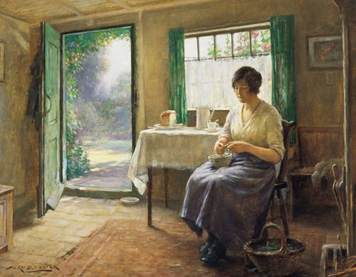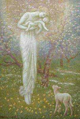 The book is small, but attractively produced, on glossy paper. Each painting is set within a border, which alternates between grey marble and cream. Small details of watercolours are interspersed with the longer poems. The choice of Victorian paintings was an apposite one, since these have a Romantic feel, often representing Nature; either a pastoral scene or a landscape. Other are interiors with perhaps one solitary, grieving individual. A few are spiritual, mostly from the Christian tradition.