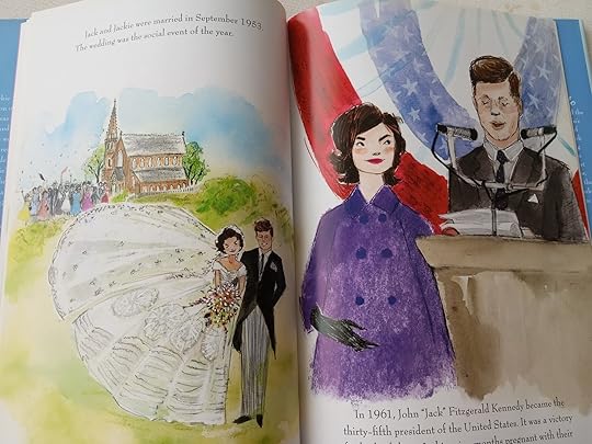 I had to sleep on it before I actually made this review. I was so surprised by my strong feelings of dislike when I read it that I actually had to be sure they stuck. I like the art - the illustrator gets a really good feel for Jackie's look and posture. However, this story is all tell and no show. There's just not much here. We're told several times how smart and clever Jackie is, but the closest we get to actually seeing evidence of this is that she reads a lot and she had a lot of the white house artifacts restored. Most of the book is just her being JFK's wife. There's practically no information about her life after JFK. This also falls into one of the pitfalls of children's picture book biographies where the author often describes how Jackie 'feels' which is not something the author would know.