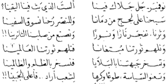 · جزائر انت عروس الدنا***و منك استمد الصباح السنا و أنت الجنان الذي وعدوا ***و إن شغلونا بطيب المنى !! و انت الحنان, و انت السماح ***و انت الطموح و انت الهنا و انت السمو, و انت الضمير ***الصريح الذي لم يخن عهدنا و منك استمد البناة البقاء ***فكان الخلود أساس البنا و ألهمتي انسان هذا الزمان*** فكان بأخلاقنا مؤمنا و علمتي آدم حب أخيه ***عساه يسير على هدينا!!! صنعتي البطولات من صلب شعب ***سخي الدماء فرعت الدنا و عبدتي درب النجاح ***لشعب ذبيح فلم ينصهر مثلنا!!! و من لم يوحد شتات الصفوف ***يعجل به حمقه للفنا!!!!!