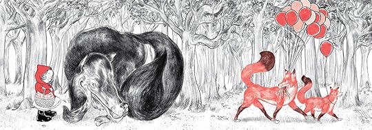 The illustrations are largely black and gray with startling blots of color, especially from little Red herself. The story starts in the end papers as we see the girl in the foreground and an impossibly long tail. Danger therefore looms even before the sly lupine appears…but who are those other animals and why are they carrying party favors?