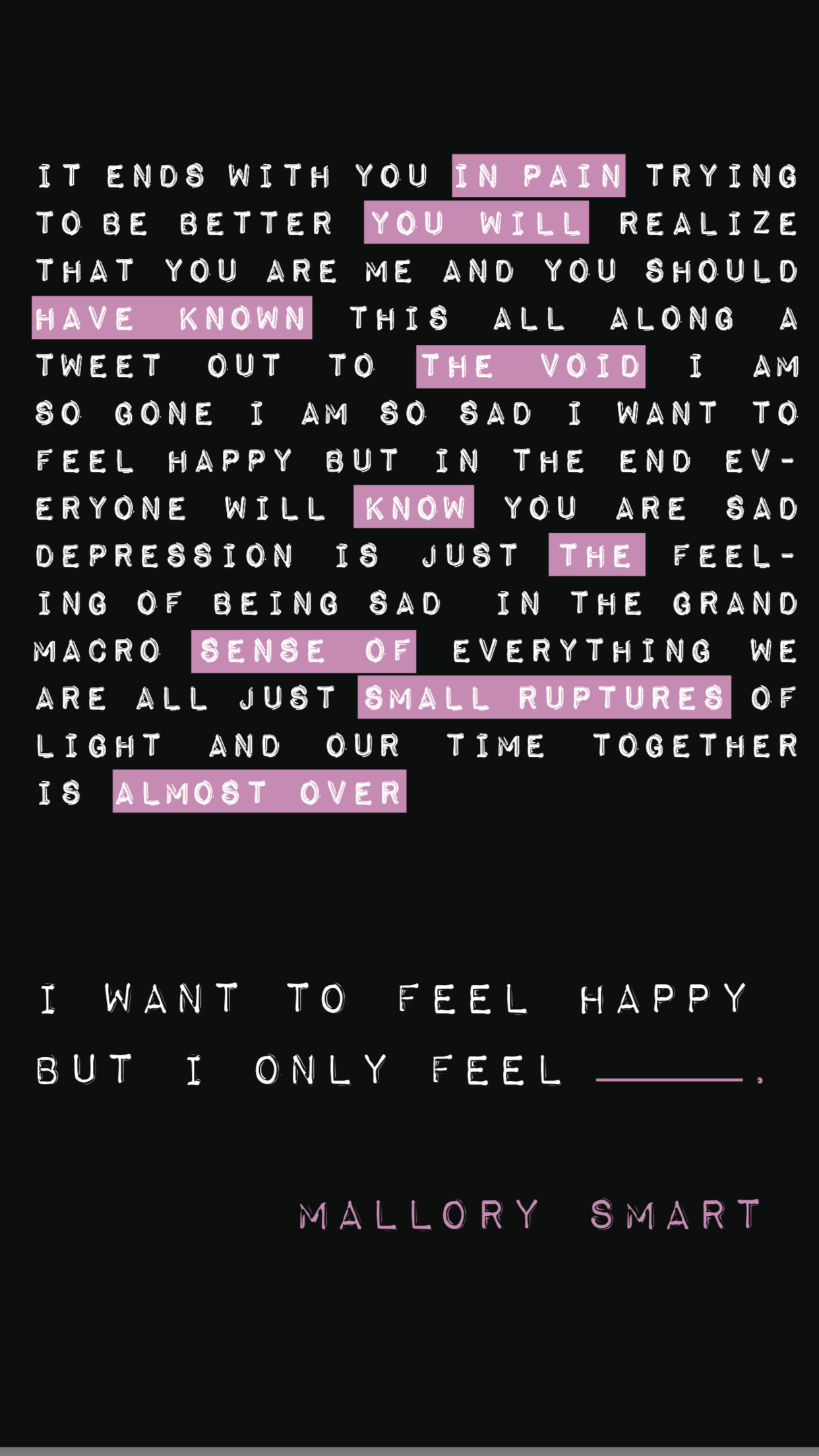 "I Want To Feel Happy But I only Feel ______," is a small book of prolific poetic wit, and attempts to grab you by the brain parts, or the insecurities you hold elsewhere (reading this will help you get over these things, or give you a chance.... TAKE IT!). It made me consider a lot of things. I would like to say, myself, but plain, vain, vanilla. The wit is like all of "Ben and Jerry's" ice cream flavors, smashed into one, and a certain medication included, to curb crying (love). Relatable again, its gets into you and it stays. Like never stopping drinking coffee (!!!!!!!1!) is indeed questionable, but this is life.... we do things out of panic, delirium, depression, spite, love, acceptance, and just being human. This literary ride is someone else Noah's Ark. And Mal brought the unicorns, and left behind the pigs. Seems a siren, calling in all sailors, we all fall for this, but thats life, bear trap here, a cord to trip over there. The acceptance is key... learning is key... (not a self help book).