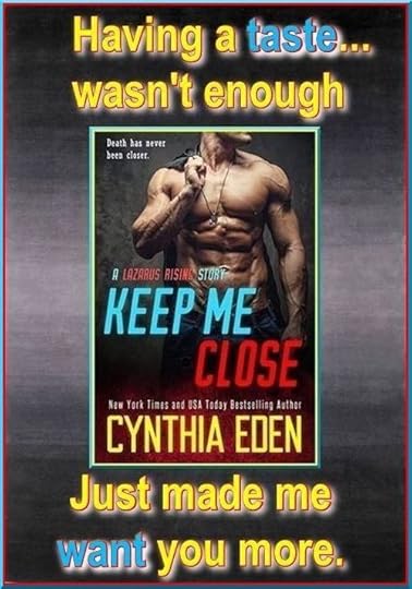 I have read almost everything Cynthia Eden writes because it is action pack, the story packs a lot into a few pages, the romance is hot fast and the characters are interesting. Just like all of her other series this one can be picked up on book 2 and readers will not feel lost but feel they are writing a new story with just enough background to understand the secondary characters who might have stared in the first book or will in the series. Keep Me Close has the same feel as many of Cynthia Edens other stories Alpha male who takes control of the female with a very caveman feel. It works in this series because the men been turned into killing machines so they are not to have normal responses but more basic response to people, Kill, Fight, Win and claim woman. The story moves fast and readers of Cynthia Eden will love this series and its perfect to curl up to a fire place and enjoy a night alone. Thank you to Netgalley and the Publisher Hocus Pocus Publishing, Inc. for the Copy.