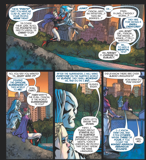 Harley, as I may have stated, is full of surprises. Maybe she does like charging into a fight, mallets, axes, fists swinging and feet kicking. But she recognizes when she’s outgunned and is perfectly willing to sit back and let superpowered people deal with superpowered menaces.