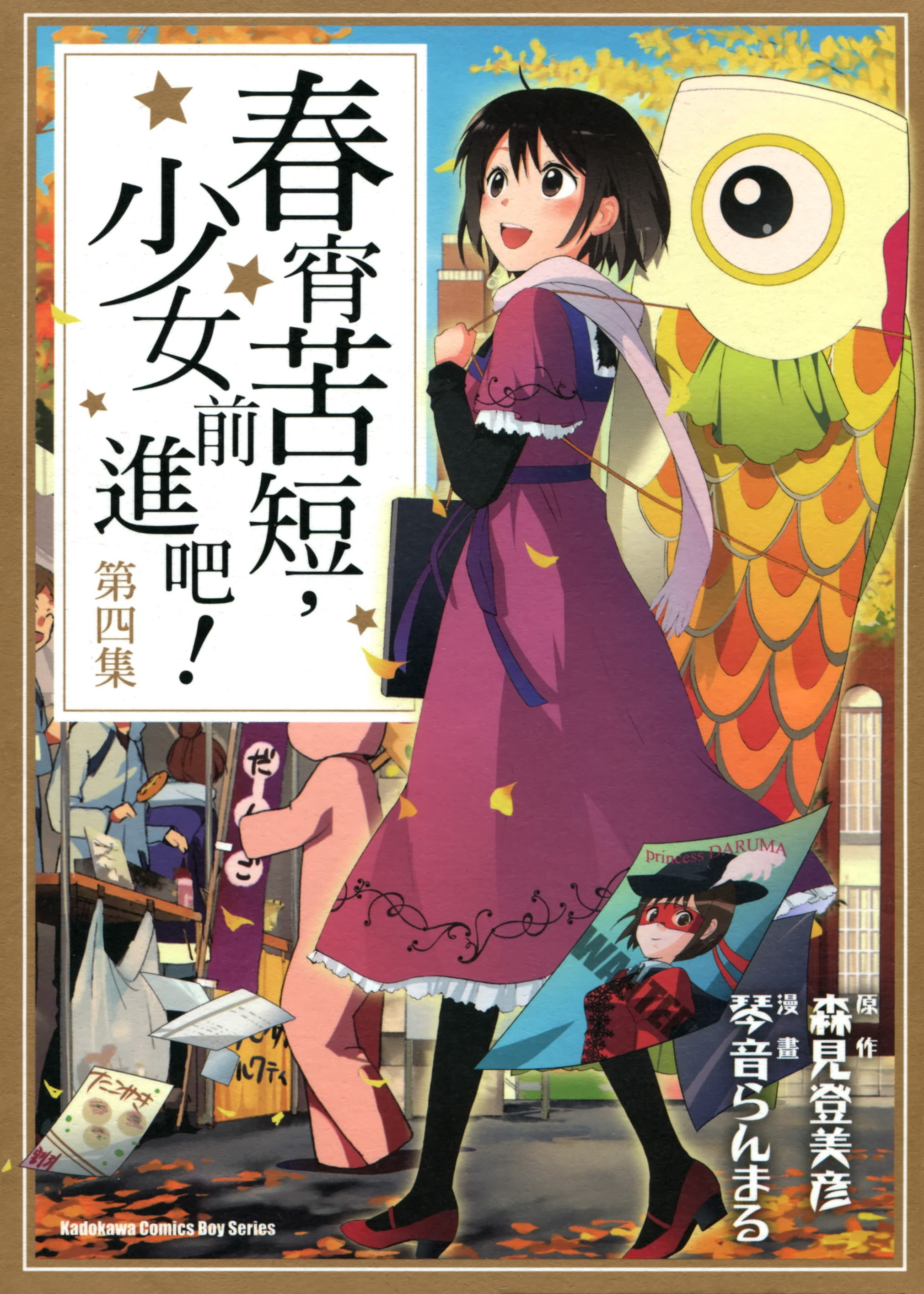 大学の後輩に恋をした『先輩』こと私は、学園祭に来ている『黒髪の乙女』を捜すも一向に見つからず。一方、乙女はアレよアレよという間に、ゲリラ演劇「偏屈王」のヒロインに抜擢されプリンセスダルマを演じる事に!