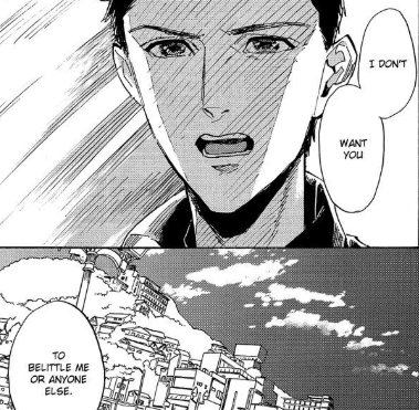 It is revealed later with his meeting with Someone that he has a hatred for anyone that are sexually different from the norm. Furthermore, he is offended to be thought of such – perhaps a hatred of himself for questioning his sexuality. This anger is carried on towards Tasuku Kaname, who stood up to him not to belittle him or his friends and confesses his feelings for him.