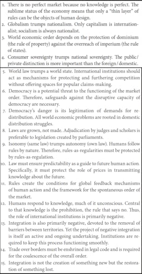 the generation which in its youth saw the sunset glow of that long and glorious sunny day of the western world, which lasted from the Congress of Vienna until August 1914, and of which those who have only lived in the present arctic night of history can have no adequate conception.Chapter Five focuses mostly on Wilhelm Röpke, a heterodox neoliberal (he quit the neoliberal Mont Pelerin society after disagreements with Hayek) who was a notable defender of South African apartheid. However, Hayek and Milton Friedman were also skeptical about boycotts of the regime, emphasising neoliberalism's priority of markets over human rights. (This is basically Friedman's only appearance in the book, adding to the confusion of the term "neoliberal".) Another example is the way the Geneva School supported freedom of movement for capital, but not for people. In the words of Gottfried von Haberler: