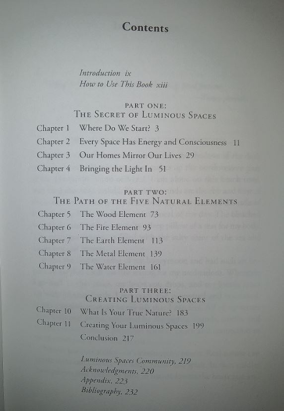 In the contents, the author outlines her plan: first unveil the secrets of luminous spaces,then discuss the five natural elements, and finally helping the reader find her own nature and her best space creation.