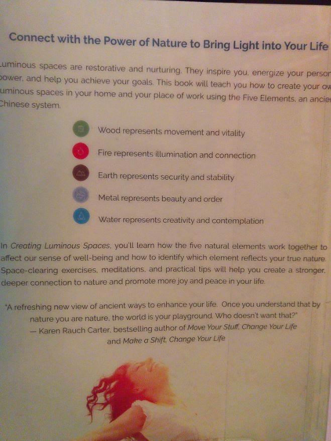 Creating Luminous Spaces is a fresh take on an old modality of using our spaces for optimal support. The author, Maureen Calamia, offers not only the explanation of how to apply Feng Shui - but also how Feng Shui relates to your own natural traits based on the 5 elements found in Feng Shui...and nature. She writes with simplicity and communicates with ease how to understand this evolving practice based on her own love of nature and its offerings. You'll want to follow her profile on Amazon so as not to miss her next release as I did as she's a bright star in the Feng Shui community of authors. Creating Luminous Spaces is a book you won't want to put down, and one you'll want to keep on your shelf to return to with each new alignment in your interior ...and your life.