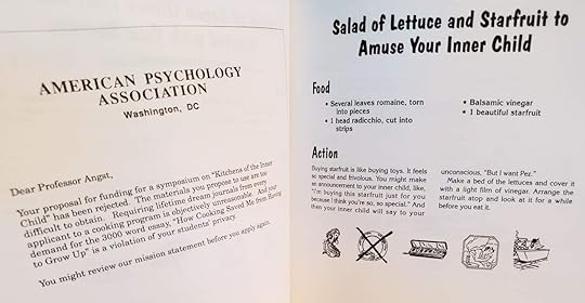 Capon Soup for Handling Intractable People Salad of Lettuce and Starfruit to Amuse Your Inner Child Garlic Pork for Overcoming Pigheaded Types 12-Step Steak Salad Trout Hate Mail Soft Eggs for When You're Feeling Inclined to Cut Things Hummus with Garnish to Conquer Ennui Total Human Experience Apples Rude-Awakening Nectarine Pudding Co-Dependent Coffee Ice & many other recipes for delectable, emotionally supportive food