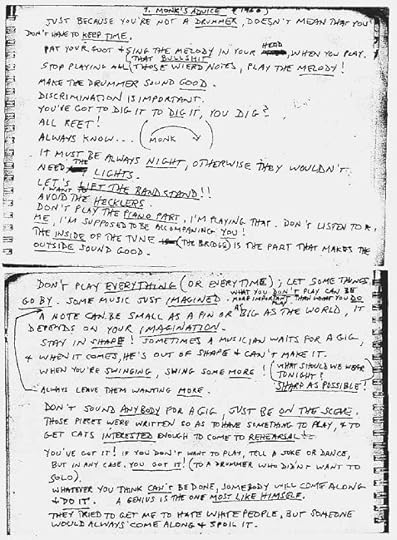Trivia and Link Thanks to this book I have finally understood what the graphic arrow and brackets in #8 of Steve Lacy's List of Monk's Advice means i.e. that "Know" is "Monk" spelt upside down 😉. Image of Monk's Advice to Musicians (as written down by saxophonist Steve Lacy) sourced from Open Culture, where you can also read a transcription.