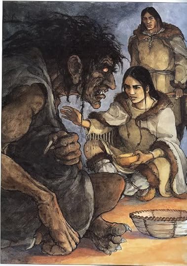 3) Nesoowa and the Chenoo- 4 stars. This was a lovely story of how kindness can transform the hardest of hearts. Nesoowa and her husband Tomas go hunting in the North Woods where Chenoo (monstrous humans who turned mad due to their evil deeds and are now cannibals) live. When one comes to get Nesoowa she greets him as her father and cares for him. This trick becomes a long-term thing and the Chenoo, Elaak, doesn't seem evil. When the time comes for him to battle another Chenoo, and Toma and Nesoowa have the means to kill him and escape, they wonder if there is not another way. Magic, from the Great Spirit Glooscap, helps them.