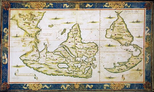 Unfortunately, the Atlas doesn't quite live up to its potential in other regards. Typographical errors abound (at one point a paragraph is cut off by an illustration and never picked up again), and it would have been useful to have some accurate modern maps to refer to when trying to pinpoint the placement of this or that tiny imaginary island. I’d say a good third of the places discussed are just that—tiny imaginary islands—and, while I appreciate Brooke-Hitching’s thoroughness in this regard, there are only so many ways to write that a bit of land was spotted in the distance by Captain A and then investigated unsuccessfully by Captain B before Captain C came along and proved conclusively that it doesn’t exist. Some of these, I think, could have been condensed into a single entry. Lastly, there’s a severe Eurocentric slant to the whole book, with maybe one or two maps of non-Euro origin featured in the whole thing; in light of that, it's hardly the comprehensive collection it purports to be.