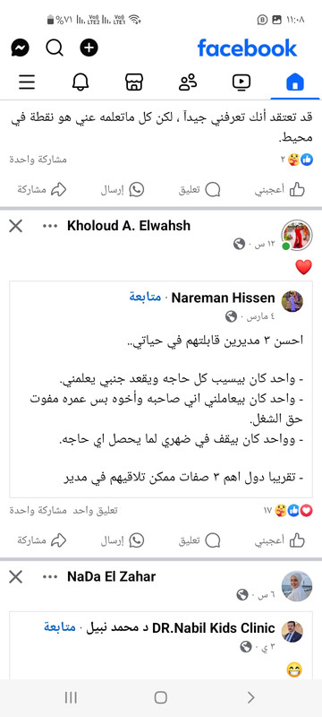 أن تري عينين تحيا بداخلهم شىء من اللاوعى و اللامنطق ترى بهم عمر من السعادات و المعارك فتعلم أن هذه العيون ستحييك على شفا حفره من الهاويه 💕 ربما نحترق ربما ينزف قلبنا مستنجدا و لكن نبقي صامدين كى لا نترك الخراب بداخلنا يكشر عن أنيابه 😒 تايه بقالى سنين بلف و اخيرا رجعت 💔 لتستفيق على صوت تناسيته لتجد أنه ما زال يقتلك و يحييك 🤩 ليلتقى قلبي بك ف مساحات شاسعه نمضي فيها بخطى من شوقى و لهفتك و حبى و جنونك و جاذبيتك العشقيه المفرطه لارتمى بين ذراعيك و اترك خلفى خريف واهن و احيا بين ضلوعك عمر من ربيع 💜❤️💕