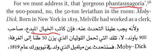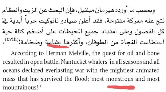 النسخة العربية فاخرة الطباعة كعادة كتب مشروع "كلمة"، لكن الترجمة كانت تقع أحيانًا في أخطاء متباينة الفداحة اضطرتني إلى معاودة الرجوع إلى الأصل الإنجليزي. وهو ما كان من المفترض أن يبطئ من سرعة قراءتي، بالإضافة إلى الثقل الذي كان يتزايد في صدري مع تراكم فصول الكتاب وطبقات الطغيان. لكنني أنهيتُ أكثر من نصف الكتاب في يوم واحد، ولا أعرف إذا ما كان سبب هذه السرعة القياسية هو الانجذاب إلى الحوت الحبيب أم الفرار من سيرة سفّاحيه الملعونين.