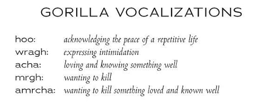 …which are then used throughout the book, as in "it makes Snub growl out loud - mrgh - but softly, so Mother cannot hear." However, in the otherwise A+ audiobook narration, four of the five tended to sound like "mhrraa;" and even if I could tell the difference, there was no way I could remember what they each meant, since I couldn't continually flip back to the above cheat sheet. Still, even without their meaning, the sounds were a nice addition to the story, and - dare I say? - "humanize" the gorillas by reinforcing that they had a (very) limited form of language.