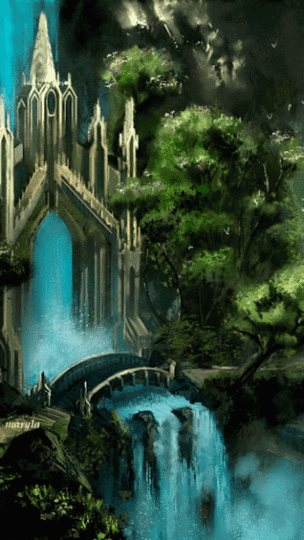 A GIF of a scifi world with a forest, a waterfall and a castle-like building in the middle of it