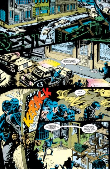 Azrael is one of the cracks through which everything that would ultimately undo DC first got its claws in – a spiky, edgy, rework of a big character; major changes reversed and characters brought back from what looked like a permanent change in a way which made it that little bit harder to invest in future stories. And yet, when you're only reading Alan Grant's sections of the saga, it's not actually that bad. Think of it as the equivalent to listening to the bits of the Doors where the schtick actually worked, and managing to put the vast majority of bands they influenced from your mind. The art helps, of course, especially when Vince Giarrano depicts a Gotham of nighted, lunatic architecture, where even regular people (such as they are) are nightmares, shark-like grins in jet-black silhouettes. A nightmare world all too similar to our own, where 50 dollars to the starving mother of a baby becomes 300 to the local connection becomes 30,000 to the prospective parents who kid themselves that their adoption was an altruistic act. The awfulness of it all, while always retaining a certain grand guignol tinge and thus never tipping into the sheer miserable bullshit that has put me right off modern Batman comics, helps explain Azrael's gradual decline and fracturing, the way his zeal to save innocents and live up to the mantle of the Bat eventually tip him over the edge. Granted, the story can't altogether dodge the thing I hate about Batman as a character. When Gordon starts whinging about the new Batman's methods, Azrael very sensibly points out that he's only allowed the death of one man, responsible for at least 25 murders and whom the authorities are seemingly incapable of keeping imprisoned, and it's not like Batman has ever operated within the law, so where's the problem? And then still saving Gordon when the old man takes a swing and nearly falls off the roof, because he wants to make clear that he does care about decent human life, which is precisely why he's fine with letting an unrepentant killer – called Abattoir, FFS - die. And yes, that also meant the death of an innocent the killer had imprisoned couldn't be prevented, but this is very much a thumb on the scales, and given how many lives would have been saved if Bruce had killed Abattoir before the most recent escape, I'd say the numbers are still in Azrael's favour. All the same, it's fascinating seeing him shouting "ONE TRUE BATMAN!" while he subsequently refuses to return the mantle to Wayne, given the way variations on that phrase have now become associated with characters played on screen by multiple actors who finally find the right casting.