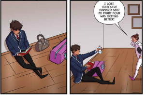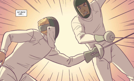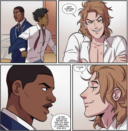 Bobby is very cute, I’ve already said so in my other review and no issue fails in underlining this simple fact. Buuut Bobby & Dante are even better. Dante waited in the gym, though he’s not at all interested in fencing, and brought him water to refresh himself. He’s just there for Bobby. I’m soooo in love with this couple!!!!