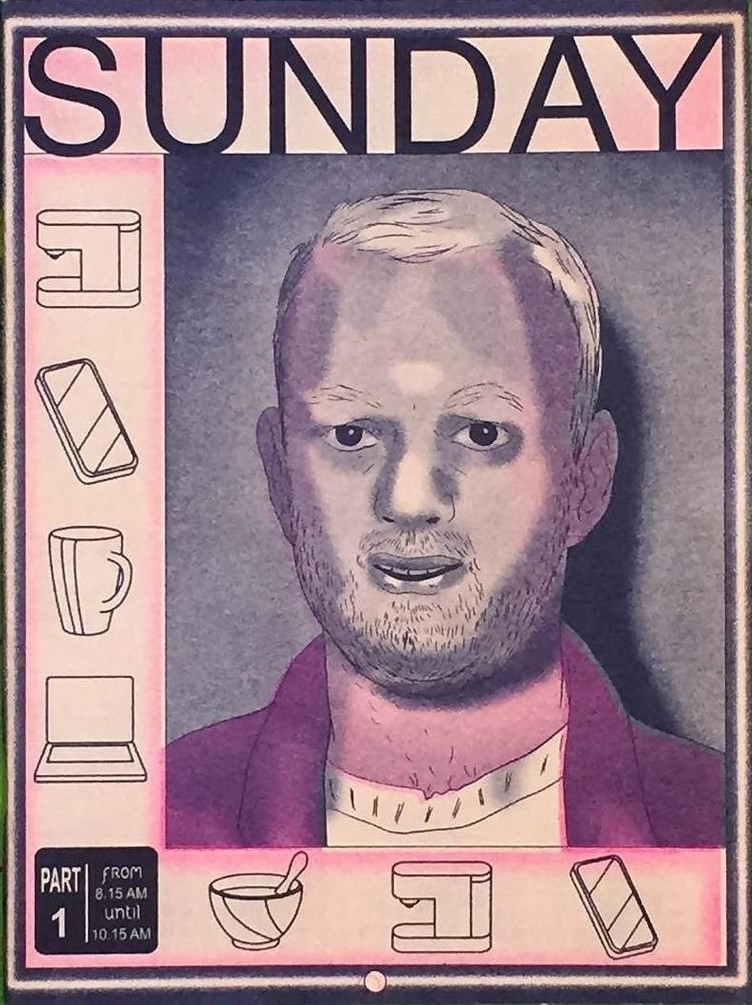 Olivier Schrauwen does a humorous slice-of-life style story featuring his cousin Thibault during a regular old Sunday morning. "Sunday Part 1" covers the time from when Thibault wakes up to him completing his weekend routine involving feeding his cat and taking a bath. Sunday is not a flattering portrait for Thibault - he's presented as a rather aloof and narcissistic individual, though it is probably how many of our own internal thoughts would make us look to other people. This is a highly voyeuristic look into the life of someone going about their morning, but Schrauwen adds a lot of nifty visual flair and creative layouts to make this such an engaging comic. And given the high quality risoprinting involved, Sunday is easily one of Schrauwen's best looking comics.