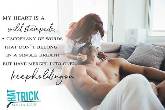 Although Hat Trick is the third book in the Blades Hockey series, it works perfectly fine as a standalone novel. The story has a start and end, one you can understand without any prior knowledge of the series. There are side characters whose love story is unknown, those told in the prior books, but this does not lessen your enjoyment. You can enjoy Hat Trick for the wonderful story it is, and be left with the desire to read Power Play and Sin Bin because you’re curious about the other character and not because of blank spots in your knowledge. You can trust me on that, as I plan to go and read the two prior books soon – I need more of Maria Luis, and I know reading the Blades Hockey series is just the start of me working through all her work.