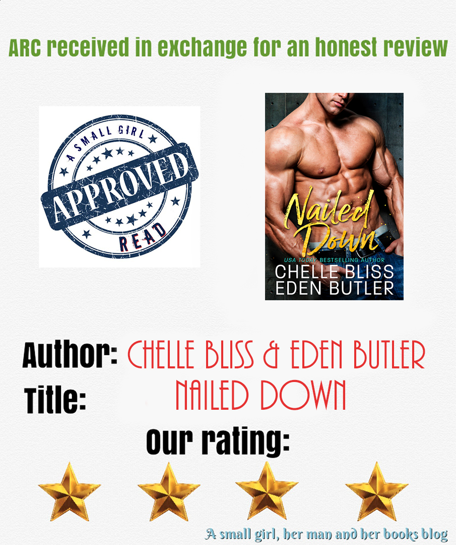 Chelle Bliss and Eden Butler deliver a love story that checks all the boxes of a favorite go to read while crossing things off of a sexy and thrilling bucket list. I highly recommend Nailed Down for the yummiest hero wearing a tool belt and the sexiest and sassiest best friend that is his match in more ways than one. Now that I have experienced Eden Butler's voice and storytelling skills, I will have to take another venture into one of her fictional world's solely created by her, since I have already read and obsessed over ALL of Chelle's books, while I wait for these two power house authors to join forces and write us devoted readers a scorcher about another sinfully delicious Kaino brother...one can only hope!