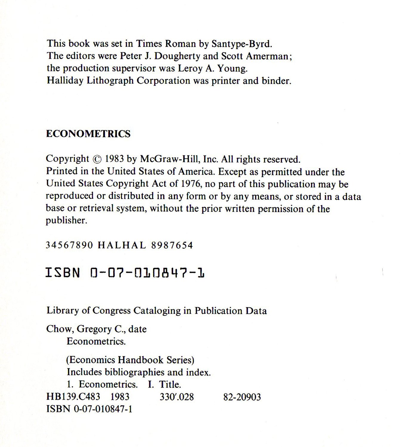 A very, very Near Fine book in About Near Fine jacket. See scans and description. New McGraw-Hill Book Company, 1983. First Edition, Fourth Printing. Econometrics, by Gregory C. Chow, from the Economics Handbook Series. ISBN 0070108471. Marked, on jacket rear panel, "Examination Copy - Not For Resale" by the publisher (scan). Octavo, navy blue jacket with white and gilt imprinting, gray cloth boards imprinted in maroon and gilt, 445 pp.(xiii + 432). A book which bears the name of a prior owner at the top of front pastedown (see scan), and is otherwise quite Fine and flawless, in an about Near Fine jacket with modest roughening at spine ends and faint adhesive residue on front panel from what was a student bookstore label. See scans. Ships in a new, sturdy, protective box - not a bag. LT28