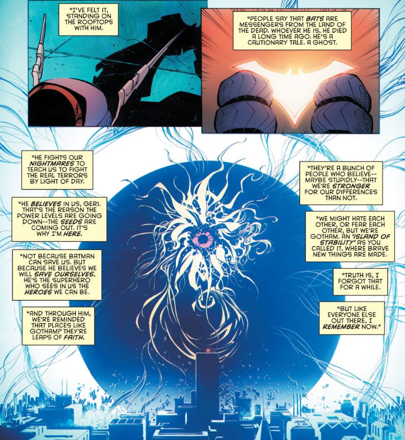 “Places like Gotham City are leaps of faith. . . We may hate each other, or fear each other. But we’re Gotham, an ‘island of stability’ where brave new things are made.”