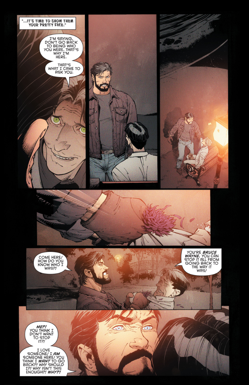 ;As I've mentioned many times here, Bruce Wayne coming back as Batman was inevitable. It's downright predictable. Snyder handled his comeback in a dignified manner that his character more than deserved. Sure, there were some annoying details such as the fact that yet another one of Dionysium's erasure side effects was the removal of Bruce's mental and physical scars. I take offense to that because has undone all the pain and suffering that Bruce has undergone to become Batman in favor of him truly becoming 'reborn' in the most literal way possible. Ergo, acquiring perfect, unblemished skin and top physical condition. So the entire emotional journey of his baptism of fire, as well as those lifelong battle scars he had worn with pride, were all for naught becomes here comes the fix-all Dionysium cure? UGH. I was not a big fan of that.