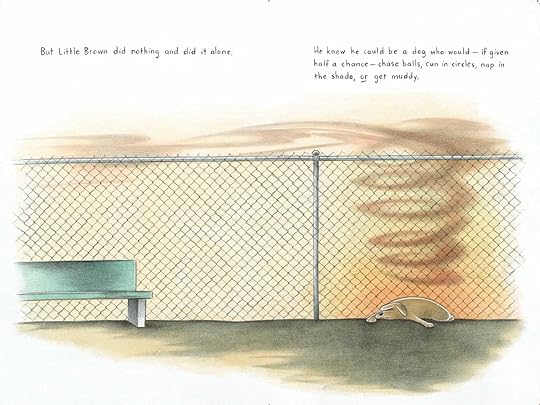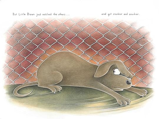 Little Brown is very cranky. The other dogs don’t play with him – he’s not sure if he’s cranky because they don’t to play, or if they don’t want to play because he’s cranky. Instead, he watches the other dogs from a corner of their chain-link enclosure (a dog park? Doggie daycare? Animal shelter?) – the big dogs chase balls, the small dog run in circles, the old dogs nap, and the young ones play in the mud. Little Brown is sure he could do any of these things, but no one asks him to. That is, until a start ball rolls his way…