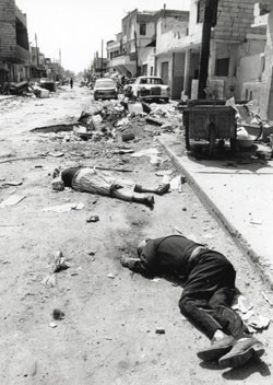 لبنان - سپتامبر1982 / شکار انسان بشیر جُمَیِل، رئیس جمهور لبنان و رهبر حزب فالانژ که متحد سرسخت اسرائیل است در بمبگذاری مقر حزب کتائب کشته میشود {لعنت خدایان تا ابد بر او باد}. از دست رفتن متحد استراتژیک اسرائیل ضربهی سختی برای این کشور است. اما وزیر دفاع وقت اسرائیل، آریل شارون از هرج و مرج پیشآمده استفاده کرده و نیروی زمینی اسرائیل را به بهانهی پاکسازی بیروت از شبهنظامیان فلسطینی و گروههای چپ لبنانی، وارد این شهر میکند. نیروهای نظامی اسرائیل پس از تسلط کامل بر بیروت غربی، اردوگاههای پناهندگان فلسطینی را محاصره میکنند. در این هنگام نیروهای تا بندندان مسلح فالانژیست، تحت نظارت ارتش اسرائیل وارد اردوگاه پناهندگان میشوند و طی دو روز، 3000 تا 3500 انسان، زن و مرد، پیر و جوان، کودک و نوزاد را سلاخی میکنند {به معنای واقعی، آنچه که قصاب بر سر لاشه میآورد}. قساوت این جنایات در حدی بود که آریل شارون، تا پایان عمرِ {نکبتبار} خود، قصاب صبرا و شتیلا نام گرفت. پس از روشن شدن ابعاد این جنایت، آمریکا و دیگر مدافعین اسرائیل نیز آن را محکوم کردند. در داخل اسرائیل نیز بزرگترین تظاهراتی که آن کشور به خود دیده بود شکل گرفت. مجمع عمومی سازمان ملل در دسامبر همان سال، وقایع اردوگاه صبرا و شتیلا را نسلکشی خواند