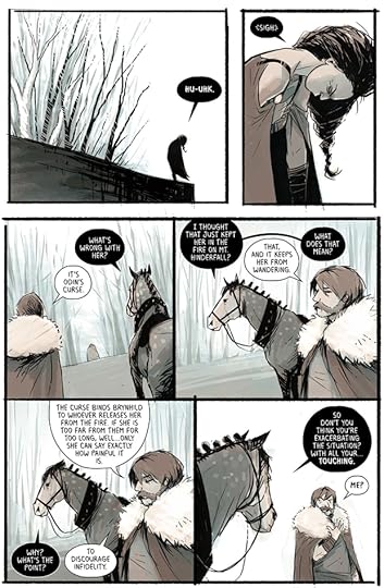 I am a little worried now about Aydis, the main heroine, the relatable mortal warrior woman; not so much for the perils she faces in-story as her very presence being diminished and overshadowed by the other characters and their plights. Freyja, Brynhild, Brynhild's immortal male lover Sig, and Saga the horse, among others, are the guides, the shadows, the web weavers, the ones pulling the silk strings, the ones exacerbating Odin's ire and man-pain, and who have problems of their own. Aydis almost feels like a pawn, a chess piece, reactive rather than proactive, in comparison.