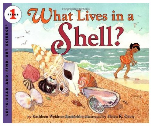 What Lives in a Shell? by Kathleen Weider Zoehfeld, is a non-fiction book about animals that live in shells, such as land snails, turtles, hermit crabs, clams, and scallops. The book explains that an animal's shell is like it's home in that it lives in it and it protects their soft bodies. It describes how some animal's shells grow along with them and how others leave their shells and move into larger, empty ones. Crab shells are likened to strong armor. Scallops use their shells to swim by opening and closing the shell quickly. The book ends by warning children to make sure that no animals are living in the shells they find at the beach before taking them home.
