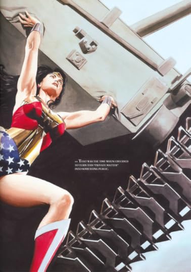 Wonder Woman: Spirit of Truth is a fantastic Wonder Woman story about Diana's want to help, yet her alienation at being a threatening outsider. There's an amazing two-page spread of Wonder Woman lifting up a tank before it rolls over a protester (I believe it's supposed to be a depiction of the Tiananmen Square protests). (WW:)"It's all right," I gently said, helping her up. "The danger's over." She stared at me fearfully for a few seconds. Then finally gasped, "What are you?" "A friend," I smiled. "A woman, just like you." "No," she shot back. "You're not at all like me!" With that she turned and ran. The girl had seen me only as an unwelcome intrusion into her world. A bizarre creature every bit as threatening as the tank that nearly killed her."