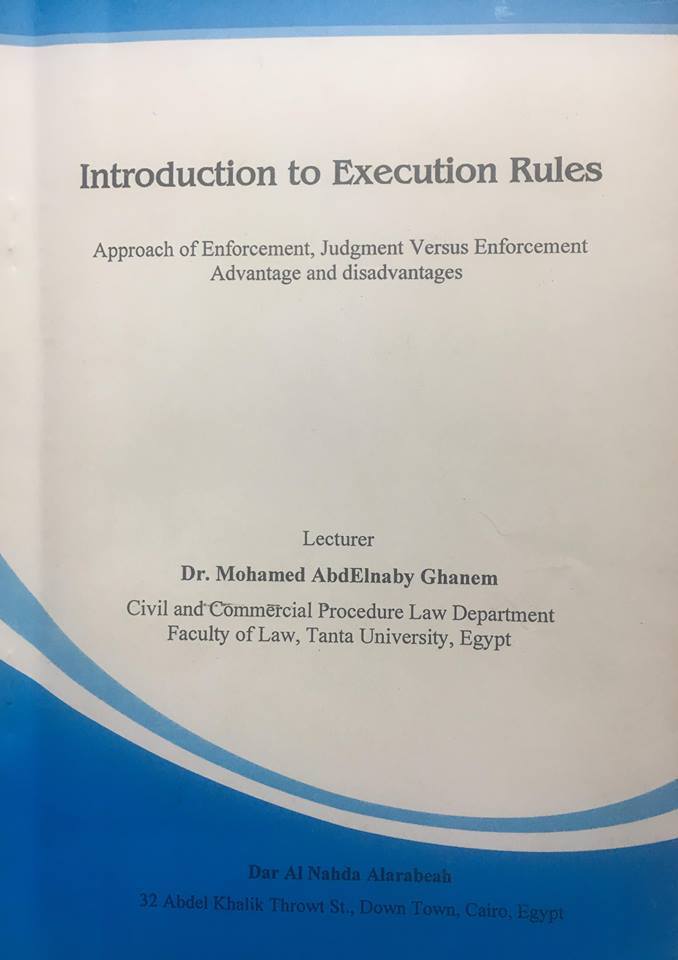 In this hand book, I have tried to set out the " Introduction to Execution Rules; Approach of Enforcement, Judgment Versus Enforcement Advantage and disadvantages" in a brief way to make them more easy to understood by the undergraduate law students. However, it should be emphasized that this little book is not, and does not aim to be a complete exposition for that subject matter, for example can be found in the great standard text books in the end of this book. The primary aim of this book is not only to help the law students in Faculty of Law, Tanta University to pass their examination in the course of " Civil and Commercial Procedure Law"; especially Execution Rules, but also to present the subject matter in an easy way to help them to follow, in their own ways and without difficulties or anxiety. May God help and bless us