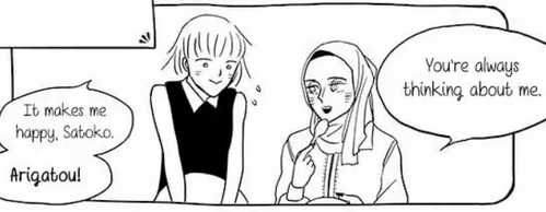 It really helps that both Nada and Satoko are quite charming. Even with the short, non-plot frames their characters radiated off the page. I realllllllllllly wanted to love Satako and Nada vol 1 and I waited for the Muslim bits to pass and the plot to come but it never did. The moments that were developed almost sufficed because of both girls' personalities but in the end there wasn't enough substance.