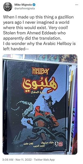 قد أحاول كثيرًا أن أعبر عن قدر حبي لمايك مينيولا وعالَم هِلبُوي، لكنني سأفشل في الغالب. يكفيني الآن أنني حاولتُ أن تخرج هذه الترجمة في أكمل الصور تعبيرًا عن هذا الحب.