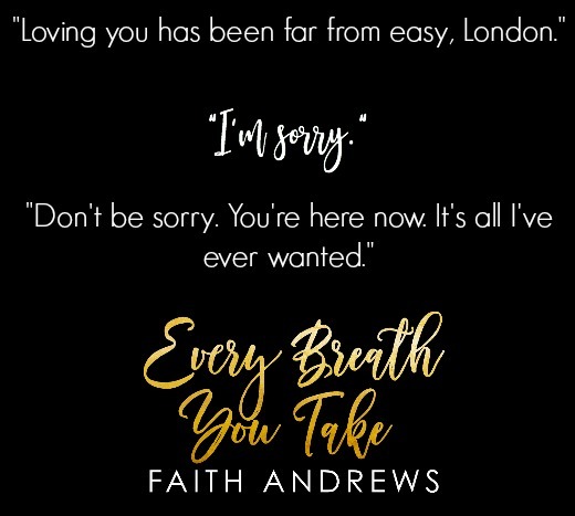 Faith Andrews never fails to create a world that grabs me from the very beginning and keeps me enthralled until the very last page. Every Breath You Take is no different and it still hasn't let me go! It is absolutely full of the feels and I felt every single one of them! My heart ached for London while she was going through all of the emotions of a divorce that shook her core. Then watching her heal a bit when she meet Bryce, my heart healed a bit right along side of her. Then when her best friend Sam returns from working abroad I couldn't help but fall head over heels in love with him. And I will say I am rooting hard for that man! I was completely captivated by this one and I couldn't get enough. Every Breath You Take is a definite MUST READ! You will not regret one-clicking this one I promise! The cliffhanger at the end has my anxiously waiting for the next in this duet! Some stuff is about to go down and I need it!!!