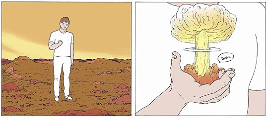 I especially enjoyed the art style. At first, everything is minimalist, all solid colors and simple lines, but once Josiane and René start letting loose and playing with their abilities, there are huge panels full of bright colors and meticulous detail. It’s a beautiful book. My only criticism is that the dialog is lettered in a tight cursive, which makes it difficult to read