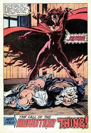 En cuanto a los argumentos, tendremos un enfrentamiento con la el Hombre Absorbente, y la aparición de un personaje de nuevo cuño y vida breve, Halcón Sangriento, pero la historia que más ha trascendido sería la de la posesión de la Bruja Escarlata por el dios-demonio Chthohn, y que... quizá cuando lo he leído en otras ocasiones lo he leído con menos atención o estaba menos picardeado, pero me parece una copia descafeinada de la saga de Fénix Oscura, e incluso la resolución de la historia viene de una escena muy semejante a otra en el primer número de Byrne en X-Men, también con Fénix mediante.