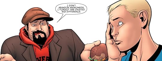 Andromeda Estranged (9-12). The finale of A&A is Roberts' strongest. That's in part because we've got a culmination of the plot to date, with the pseudo-cloning of Armstrong drawing to a conclusion as does the tale of our bag-escapee. Meanwhile, we've got an intriguing new plot about space beings, or some such, that I'd like to learn more about (but apparently in some future comic). There may not be as much strong humor in this volume, but there's some, and there's less silliness too [4/5].