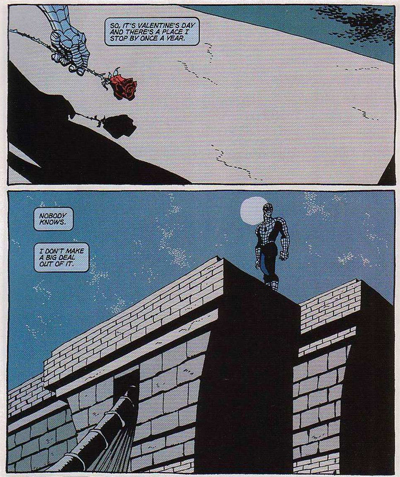 Those familiar with artist Tim Sale’s work will not be surprised by his one-of-a-kind style in these stories and will be impressed by the tone and emotion he is able to convey throughout each of them. While most of his design works wonderfully with writer Jeph Loeb’s story and ideas, there are instances where the story seems to simply fit perfectly with his artistic vision, allowing panels to convey far more than it could’ve without the words to embellish the moment with poetry and power. The occasional splash pages, especially to emphasize certain love interests or costumed vigilantism, make for spectacular moments as well. The colouring also gives the story an additional layer of complexity in terms of narrative depth, as previously mentioned in terms of symbolism, but also allows for excellent atmospheric tone and mood.