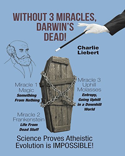 Without 3 Miracles, Darwin’s DEAD! In this simple, non-technical source that Christians can use in their battle for men’s souls presents irrefutable evidence showing Atheistic Evolution is impossible. Evolution’s greatest failures are the violation of three scientific laws, the 1st and 2nd Laws of Thermodynamics and the Law of Biogenesis. I call these three Magic, Frankenstein, and Uphill Molasses. We’ve all seen the magician pull the rabbit out of the “empty” hat. That’s an illustration of the violation of the 1st Law, something coming out of nothing. With the hat or the Universe, it's either impossible or an illusion but, in any case, it's not REAL. Failure ONE In Mary Shelley’s novel, Dr. Frankenstein takes parts of dead men, assembles the parts and produces a living man. It's a great story but we all know it's fiction, yet Evolution would have us believe it happened. Failure TWO Uphill The 2nd Law establishes the Universe is irreversibly running down after being “wound up” at the beginning. Evolution is the opposite of this process. It advances to more complexity, more diversity and new "higher" life forms. Molasses don’t flow uphill and neither can Evolution. Other arguments missing-missing links, biological complex creatures, Evolution frauds, and complex “natural” processes. Richard Dawkins said. "Evolution has been observed. It's just that it hasn't been observed when it's happening.” Chapters 5-6 analyze WHY Non-Christians MUST cling to believing in Evolution, Finally we’ll look at terrible costs it has on our culture. Truly Science proves Evolution’s IMPOSSIBLE! Without 3 Miracles, Darwin’s DEAD! Foreword, Preface & Introduction Chapter 1 Science and Knowing Chapter 2 Evolution The Appearance of Matter From Nothing Abiogenesis - Dead Chemicals Become Living Organisms Increased Information in Genetic Systems Chapter 3 Evolution’s Three Impossible Miracles Chapter 4 the Improbable Cliff! Chapter 5 The Irrationality of Unbelief Chapter 6 What’s an Atheist To Do? Chapter 7 Cultural Impacts of Evolution Conclusion Appendix 1 About the Author - Charlie Liebert Appendix 2 Charlie Liebert’s Testimony